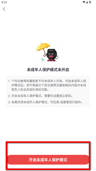 4、在未成年人保護(hù)模式頁面,點擊開啟未成年人保護(hù)模式按鈕,即可進(jìn)行模式開啟操作。