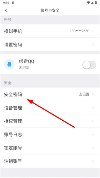4、在賬號與安全頁面點(diǎn)擊安全密碼選項,按提示完成安全密碼設(shè)置。
