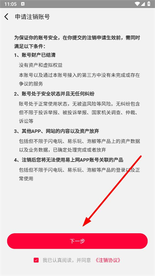 4、在申請注銷賬號頁面勾選同意注銷協(xié)議后,點擊下一步,即可按流程注銷賬號。