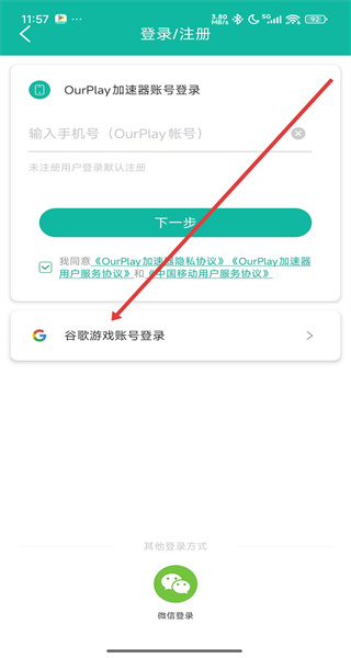 1、在進入到OurPlay登錄頁面中時,可以點擊下方谷歌郵箱賬號登錄按鈕,使用谷歌賬號進行登錄。
