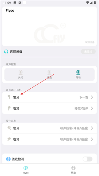 1、打開(kāi)Flycc應(yīng)用,在輕點(diǎn)兩下耳機(jī)設(shè)置中,點(diǎn)擊左耳。