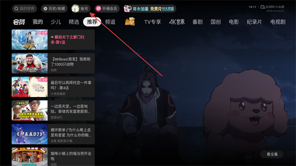 1、啟動云視聽小電視的APP,進入首頁點擊上方賬號的按鈕。