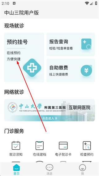 1、打開中山三院用戶版APP,在首頁點(diǎn)擊預(yù)約掛號(hào)。