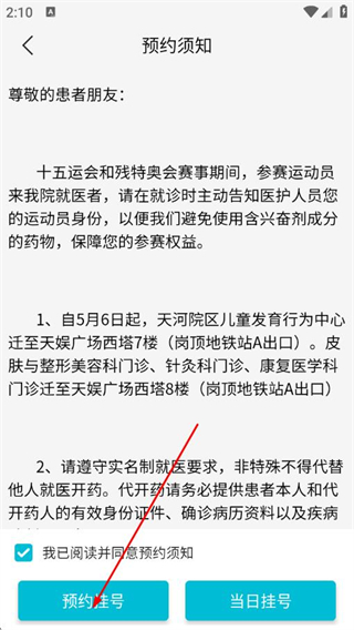 2、在預(yù)約須知頁面,勾選約須知后,點(diǎn)擊預(yù)約掛號(hào)按鈕。