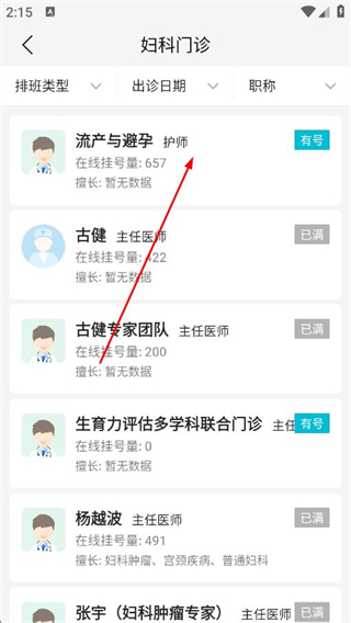 5、在婦科門診頁面,選擇有號(hào)的醫(yī)生。