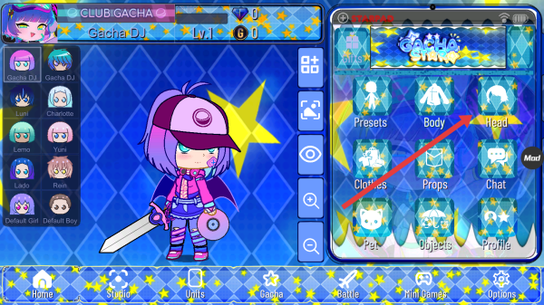 2、在Gacha-Star角色編輯界面,點(diǎn)擊右側(cè)菜單欄的Head選項(xiàng),進(jìn)入頭部裝扮設(shè)置頁(yè),可調(diào)整發(fā)型、頭飾等外觀。