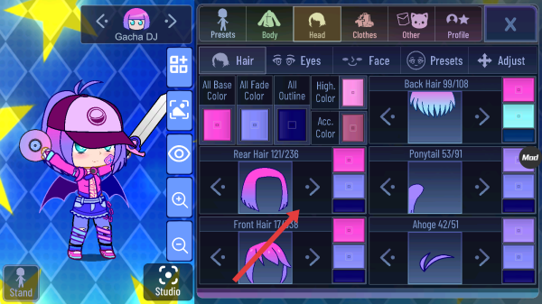 3、在頭部編輯的Rear-Hair欄目,點(diǎn)擊切換箭頭,更換角色后腦部位的發(fā)型樣式,打造獨(dú)特角色造型。