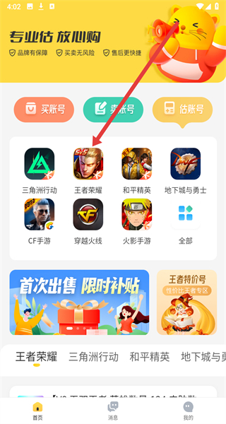 1、在游戲賬號交易APP主界面點擊“估賬號”,進入游戲選擇頁面。
