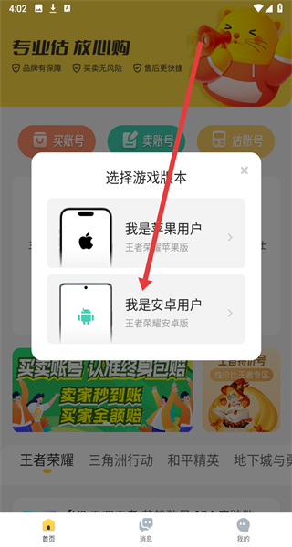 3、在選擇游戲版本彈窗中點擊“我是安卓用戶”,進入王者榮耀安卓版賬號估價頁面。
