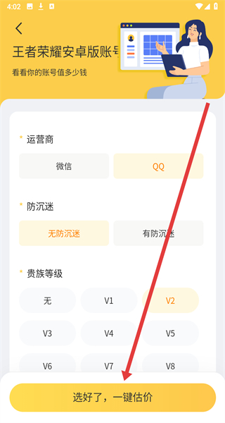 4、在王者榮耀安卓版賬號估價頁面選擇運營商、防沉迷狀態(tài)、貴族等級等信息后,點擊“選好了,一鍵估價”,完成賬號估價操作。