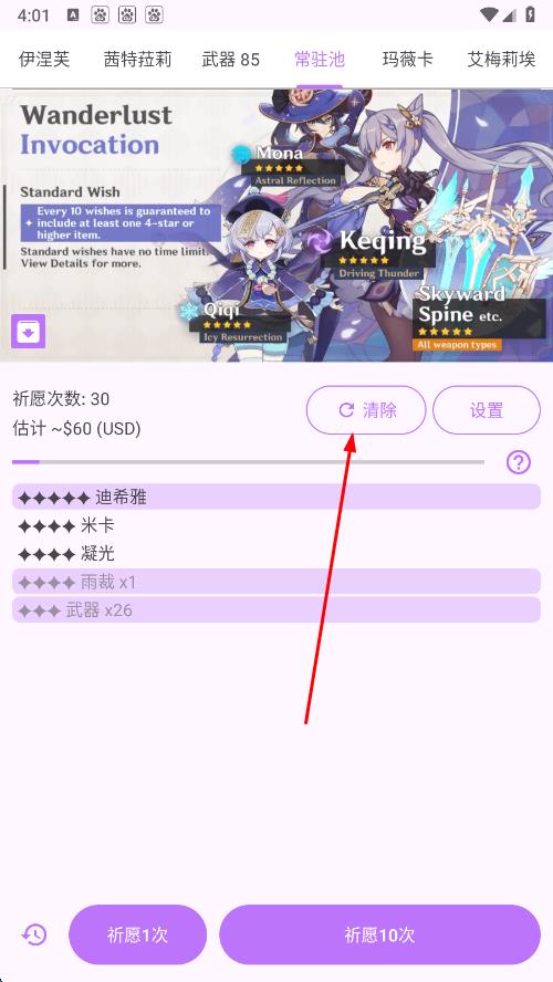 1、在原神抽卡模擬器界面,找到清除按鈕并點擊,可清除當前顯示的祈愿次數(shù)和抽卡結果記錄 。
