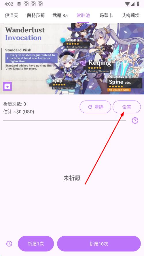 3、若想進行更徹底的設置,比如清除所有歷史祈愿記錄,點擊設置按鈕。