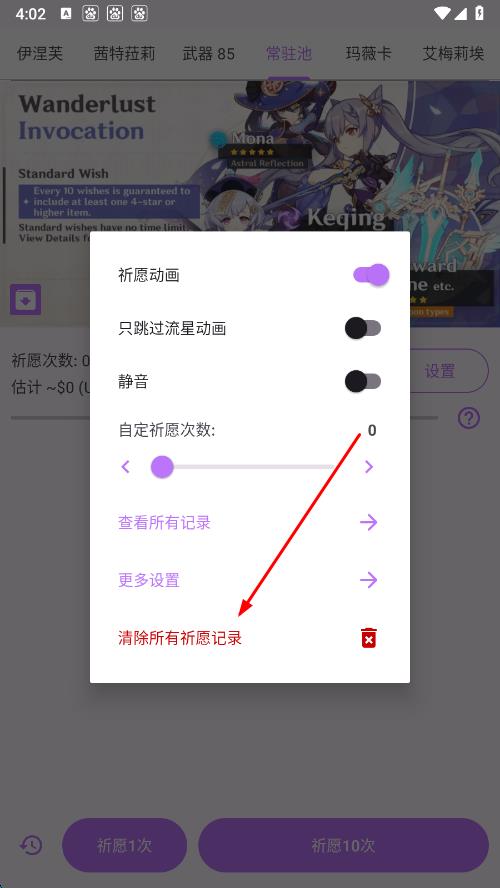 4、在彈出的設置菜單中,找到清除所有祈愿記錄選項,點擊即可刪除模擬器保存的所有祈愿數(shù)據。