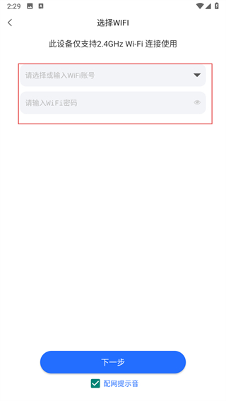 5、輸入WiFi賬號和密碼,點(diǎn)擊下一步即可完成設(shè)備添加。