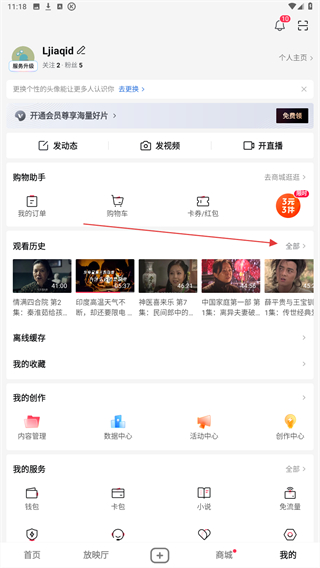 2、進(jìn)入我的頁面內(nèi),在觀看歷史的右側(cè)點(diǎn)擊全部的按鈕。