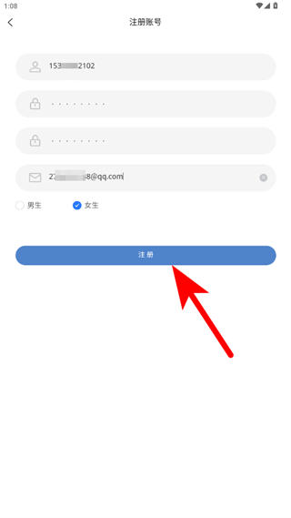4、在注冊(cè)賬號(hào)頁(yè)面填寫(xiě)賬號(hào)、密碼、郵箱,選擇性別后點(diǎn)擊注冊(cè),完成賬號(hào)注冊(cè)。