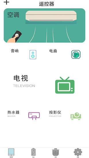 集電視遙控、空調(diào)遙控、機頂盒遙控、掃地機器人遙控、燈具遙控、電扇遙控、空氣凈化器遙控、投影儀遙控、熱水器遙控等13種家電于一體的家居智能關(guān)懷軟件