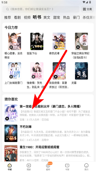 1、在得間小說書城頁面,找到并點擊想要調整語速的聽書書籍。
