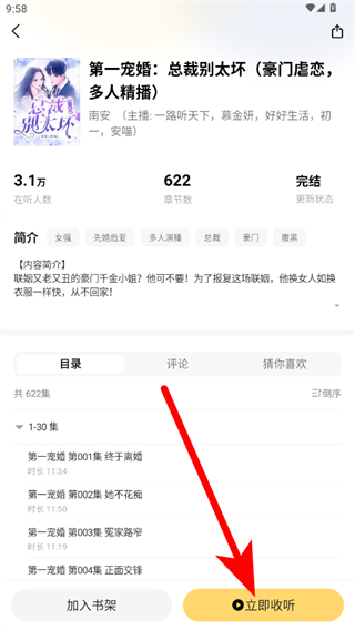 2、在書籍詳情頁面,點擊立即收聽按鈕,進入聽書界面。