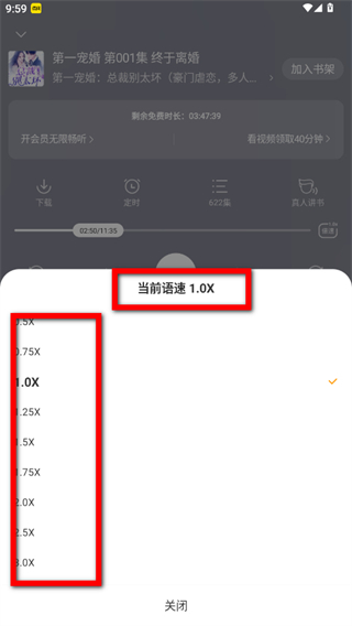 4、在語速選擇列表中,點擊想要的語速選項,即可調整聽書語速。