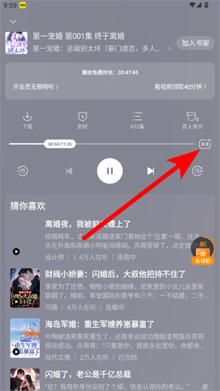 3、在聽書界面,點擊倍速選項,展開語速選擇列表。