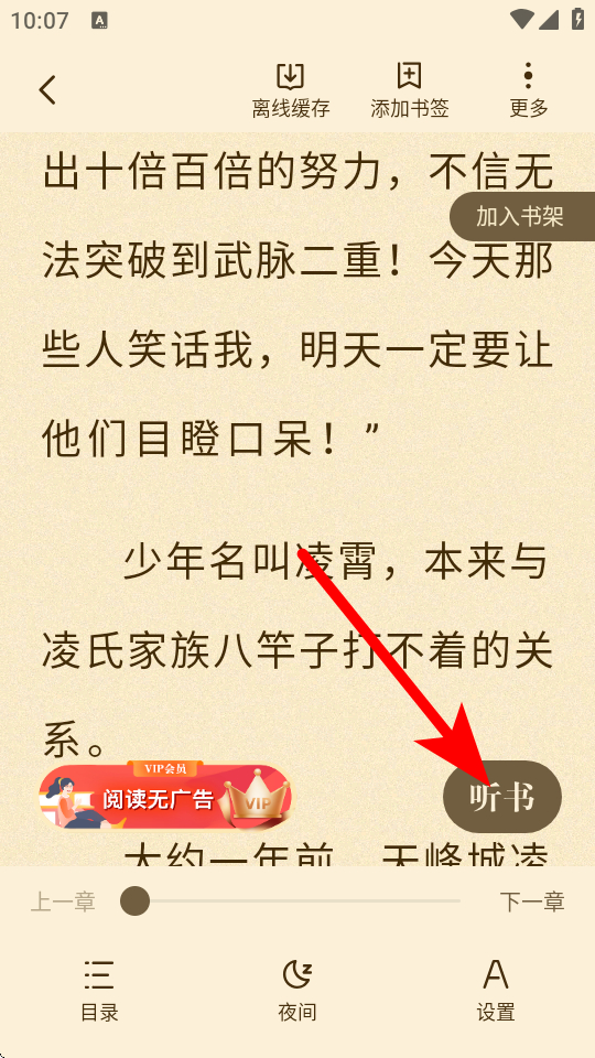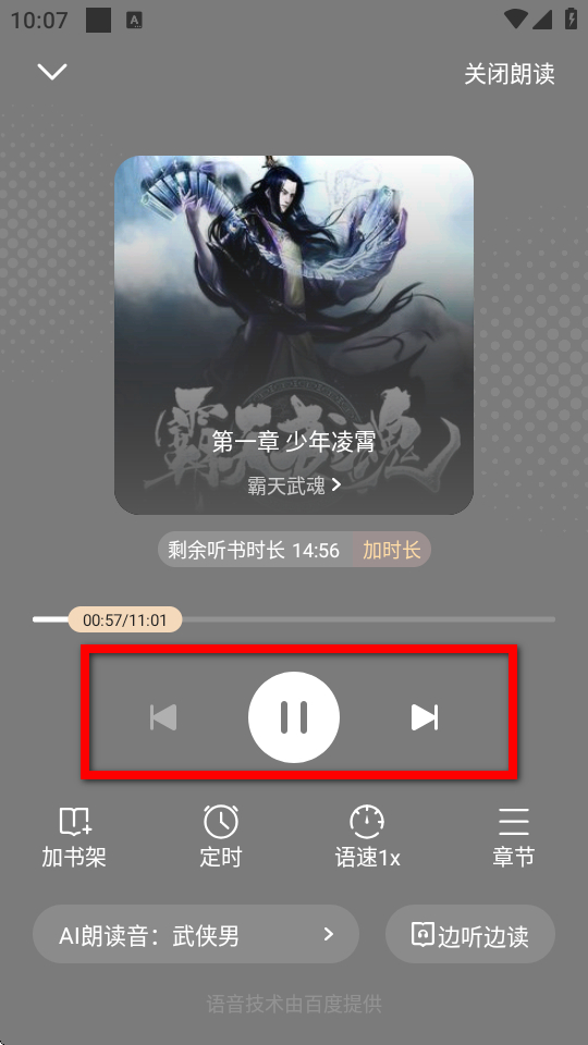 2、在小說閱讀界面,點(diǎn)擊聽書按鈕,進(jìn)入聽書播放界面。
