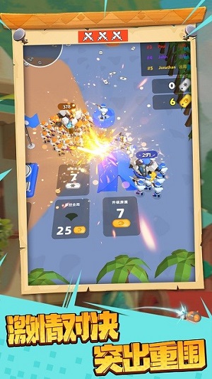 王國(guó)戰(zhàn)爭(zhēng)模擬器玩家扮演島上總指揮官,需要就地建立兵營(yíng)和快速招募士兵,通過(guò)游歷四方撿取金銀財(cái)寶,升級(jí)武器和兵營(yíng)防御力,從而擊退敵軍士兵和攻打敵軍兵營(yíng)。