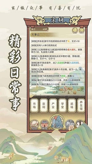 1、至成年家人的仕途和生死,小至孩童抓周和考試,家族內(nèi)發(fā)生著非常多樣的隨機(jī)事件要你著手處理,而你的每個(gè)選擇也會(huì)影響家族的走向;