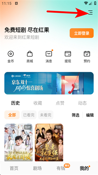 1、在紅果短劇我的頁面,點(diǎn)擊右上角三條橫線圖標(biāo),彈出功能菜單。