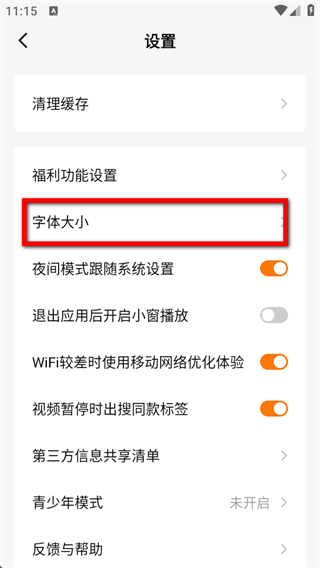 3、在設(shè)置頁面,點(diǎn)擊字體大小選項(xiàng),進(jìn)入字體大小預(yù)覽界面。