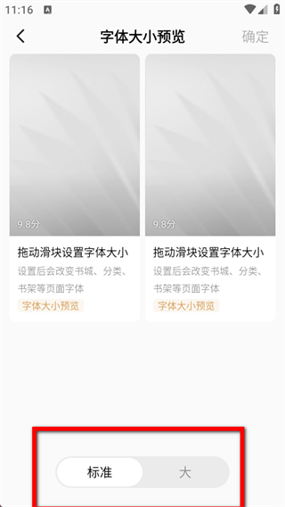 4、在字體大小預(yù)覽界面,可選擇標(biāo)準(zhǔn)或大字體,設(shè)置完成后點(diǎn)擊確定即可。