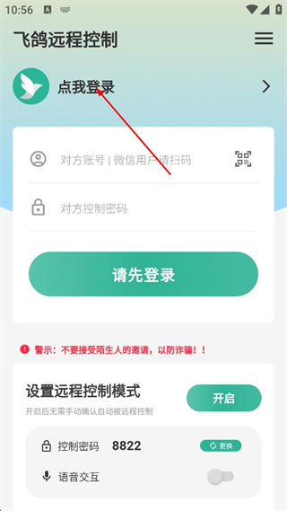 1、打開飛鴿遠(yuǎn)程控制APP,點(diǎn)擊“點(diǎn)我登錄”進(jìn)入登錄頁(yè)面。