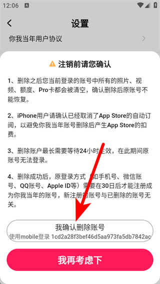 4、在注銷確認(rèn)頁面,點擊我確認(rèn)刪除賬號按鈕,即可完成賬號注銷操作。