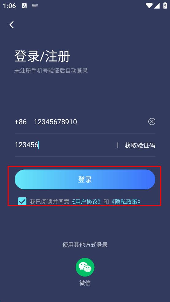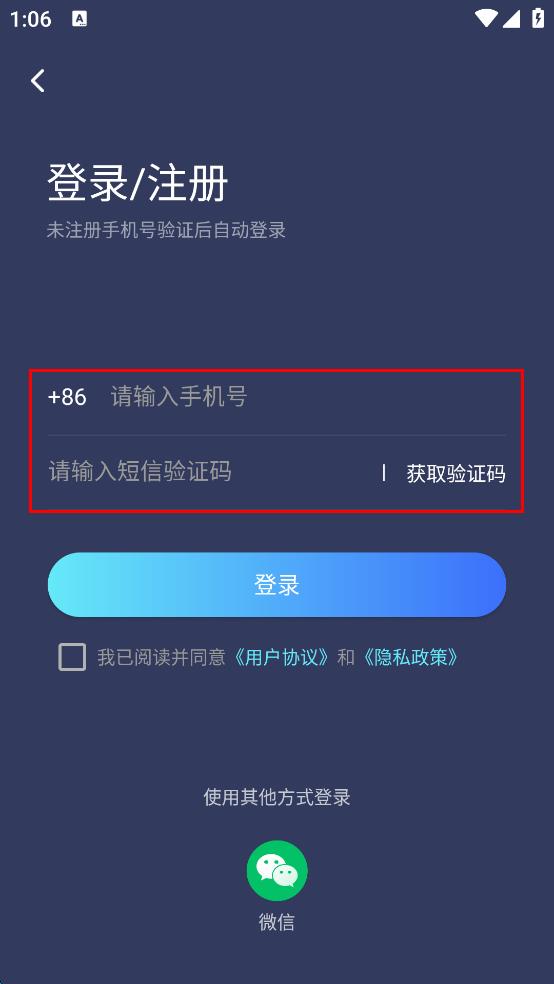 3、輸入手機(jī)號(hào)和驗(yàn)證碼,勾選我已閱讀并同意用戶協(xié)議和隱私政策。