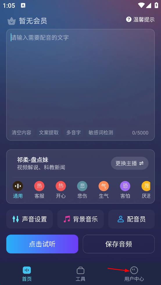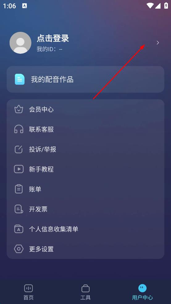 1、打開配音類軟件首頁(yè),點(diǎn)擊右下角用戶中心。