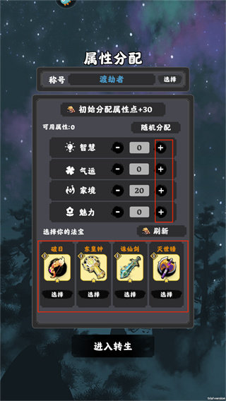 5、進(jìn)行屬性分配,可以選擇智慧、氣運(yùn)、家境、魅力等不同的屬性,同時(shí)還可以選擇你的法寶;