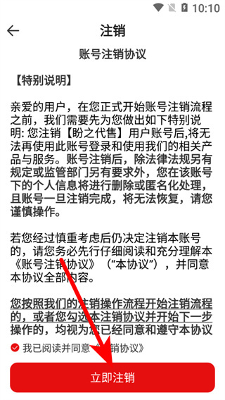 4、在注銷協(xié)議頁面,勾選同意協(xié)議后點(diǎn)擊立即注銷按鈕,即可進(jìn)行賬號(hào)注銷操作。