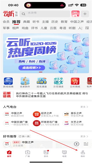 1、打開云聽的應(yīng)用,點(diǎn)擊首頁右下角我的圖標(biāo)。
