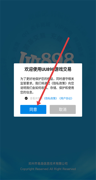 1、在UU898游戲交易平臺的“歡迎使用UU898游戲交易”彈窗點擊“同意”,進入主界面。