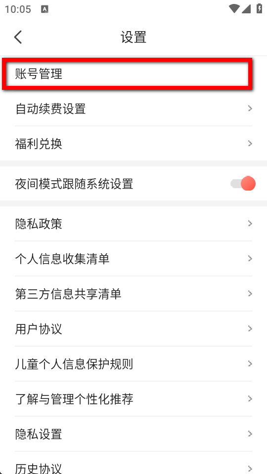 3、在設(shè)置頁面,點(diǎn)擊賬號(hào)管理選項(xiàng),進(jìn)入賬號(hào)管理界面。