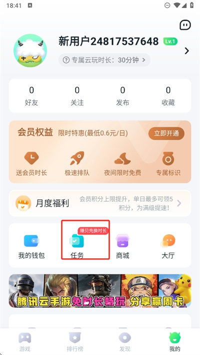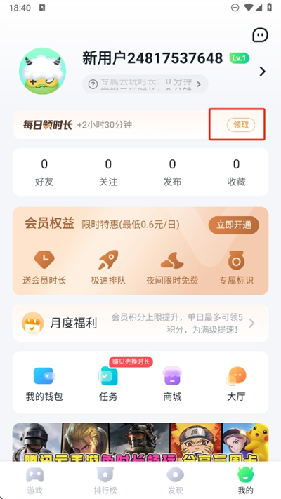 2、然后我們能夠在這里看到每天可以免費領取的時長,點擊領取即可增加免費的云玩時長;