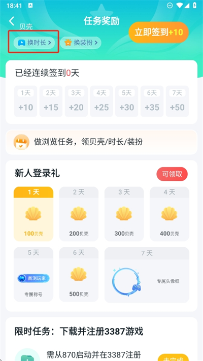 4、接著進入就可以看到如何完成任務并獲得貝殼,然后點擊這里可以看到如何兌換時長;