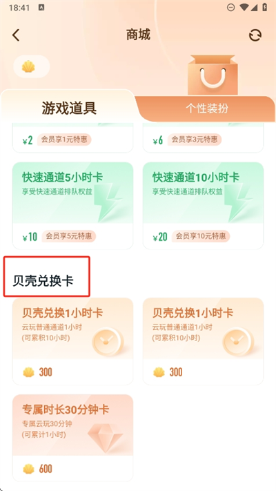 5、在游戲道具這里往下滑就可以看到貝殼兌換卡,利用多少個數(shù)量的備課可以兌換不同時長卡使用。