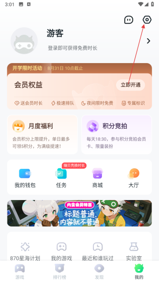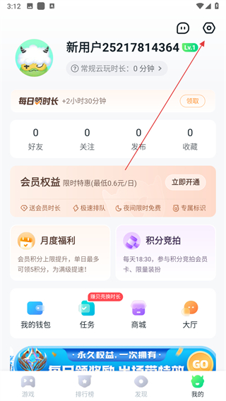 1、打開870游戲盒應用,點擊底部導航欄右側的我的選項,進入個人中心頁面,找到右上角齒輪形狀的設置圖標并點擊。