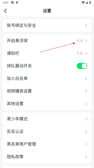 2、在設置的頁面中,找到開啟懸浮球的選項并點擊,跳轉至設置界面。