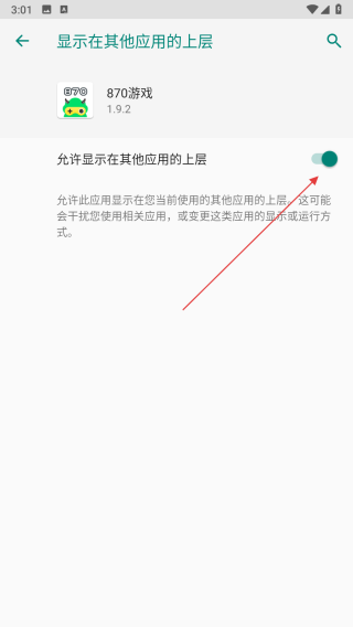 3、在該界面中,將允許顯示在其他應用的上層右側的開關按鈕開啟,即可啟用870游戲盒的懸浮球功能。