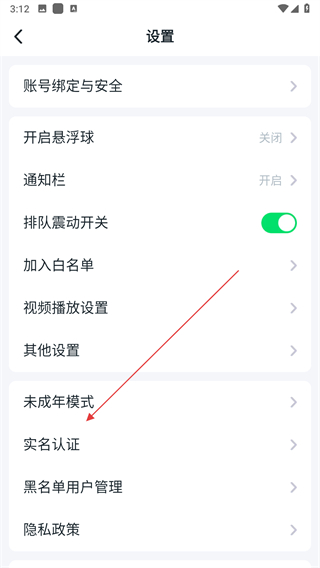 3、在設置界面中,向下滑動找到實名認證選項,點擊進入實名認證頁面。
