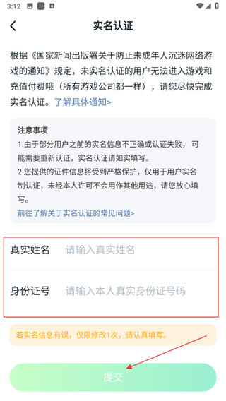 4、在實名認證頁面,按照要求填寫真實姓名和身份證號,點擊提交按鈕。