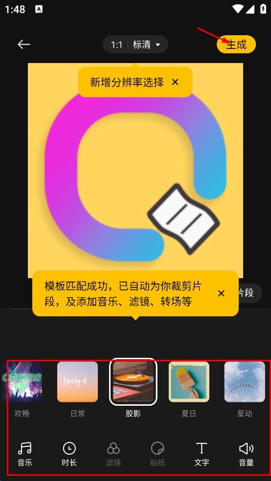 4、在成片編輯頁面可設(shè)置模板、音樂等,然后點(diǎn)擊生成,完成快速成片操作。