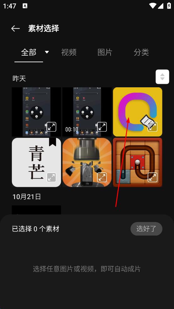 2、進(jìn)入素材選擇頁面,選擇要用于成片的素材。